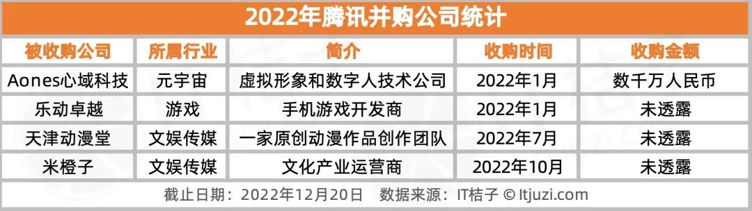 抛开这笔交易,腾讯 2022 年并未有大额并购事件。腾讯年初以数千万并购虚拟形象和数字人技术公司 Aones 心域科技,并购手机游戏开发商乐动卓越,之后又并购原创动漫作品创作团队天津动漫堂和文化产业运营商米橙子。