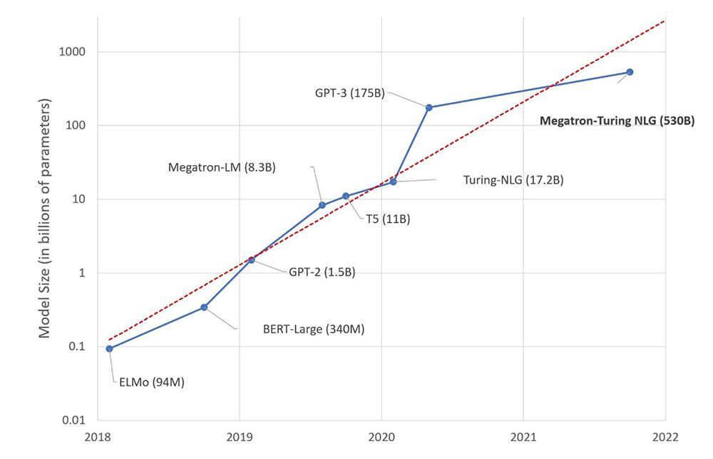 2021 年 10 月,微软和英伟达正式推出由 DeepSpeed 和 Megatron 驱动的 Megatron-Turing 自然语言生成模型(MT-NLG),声称有 5300 亿参数,在当时宣传这是训练的最大最强的解码语言模型。不过在2022年并没有取得更新的进展。