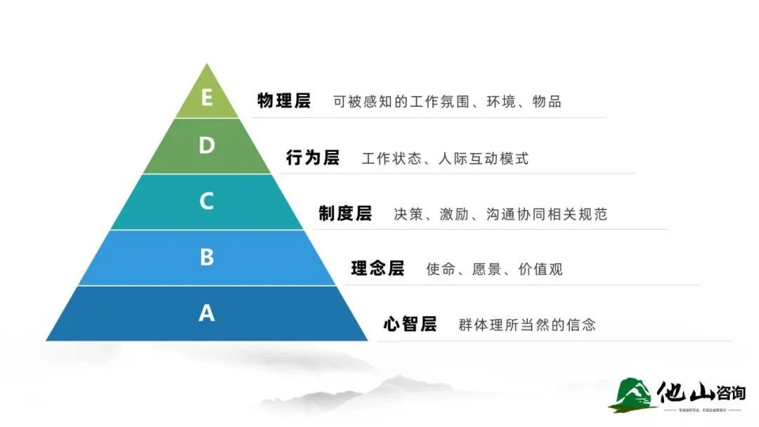 结合多年在各个企业的实际工作经验,以及为了便于企业的落地操作,我把文化划分为5个层次: