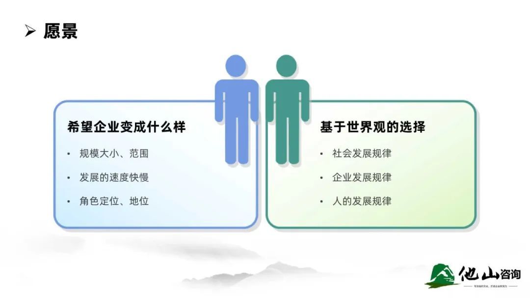愿景是希望企业变成什么样,到底是多大的规模,什么样的范围,发展的速度以及相应的定位和地位。它是基于世界观的选择,包括社会、企业、人的发展规律。