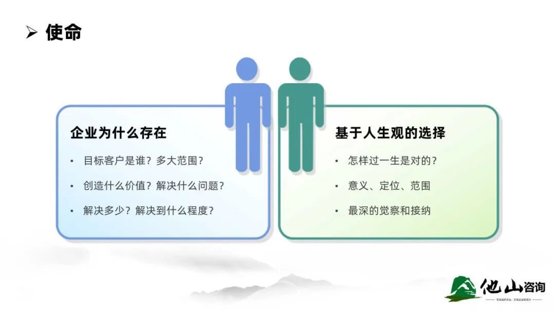 我曾经帮好几家公司梳理使命和愿景,过往他们都是自己梳理,但出来以后发现,大家根本就不信,因为原先只是理了一个口号,我在这个过程中会走得更深一些。