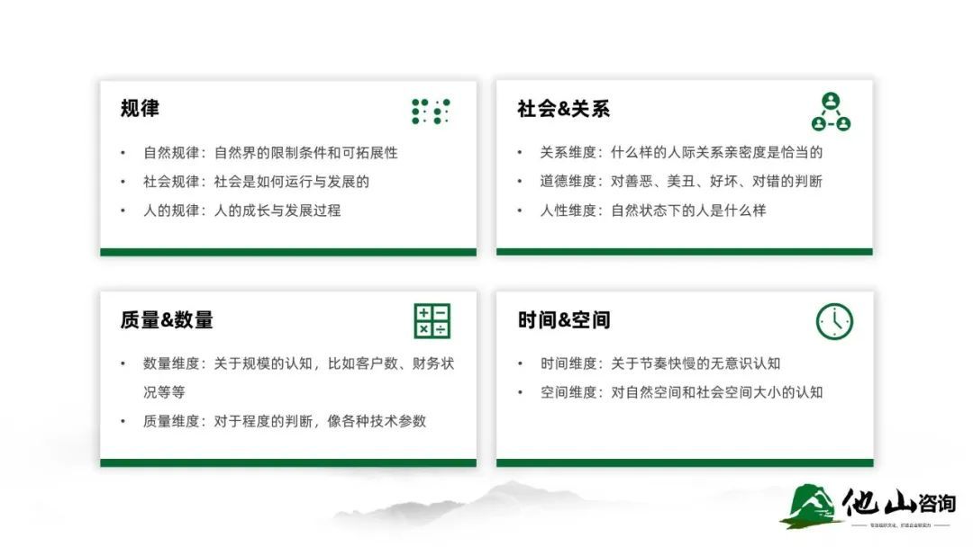 所以我在分析很多企业文化的时候,我会先探究创始人以及核心决策成员的心智模式。企业的组织心智,包括四个大的模块:发展规律、社会&关系、质量&数量、时间&空间的不同认知。当我们在做文化梳理的时候,需要一步一步探究。