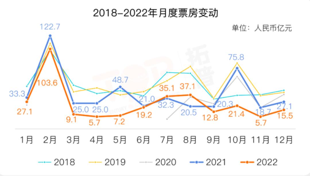 也是在这一年,超过一百天的大盘单日票房不过两千万。从具体月份来看,拓普报告显示,2022年3-5、9-12月票房均为近9年历史同期最低,只有春节档所在的2月份和受《独行月球》《人生大事》等强片加持的7-8月票房表现相对较好。