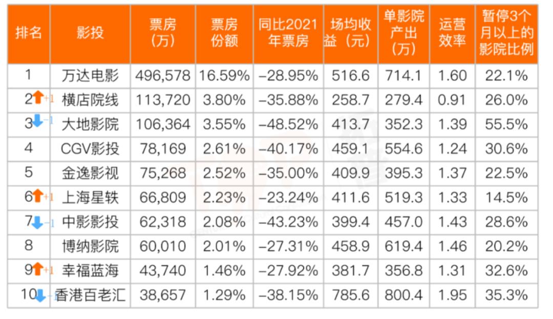 拓普报告显示,头部院线票房排名较去年相对稳定,中影数字票房排名较2021年上升2位至2022年第2,横店院线、幸福蓝海各上升1位,分别至第6、7位;头部影投票房排名小幅变动,横店院线、上海星轶、幸福蓝海票房排名较2021年各上升1位。