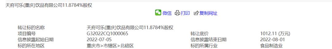 2018年后,天府可乐的发展虽有起色,但 在可口可乐、百事可乐两大可乐“霸主”挤压下,仍难言乐观 。2022年7月,相关部门官网公告披露,重庆轻纺集团方面拟转让天府可乐(重庆)饮品公司11.8784%股权。