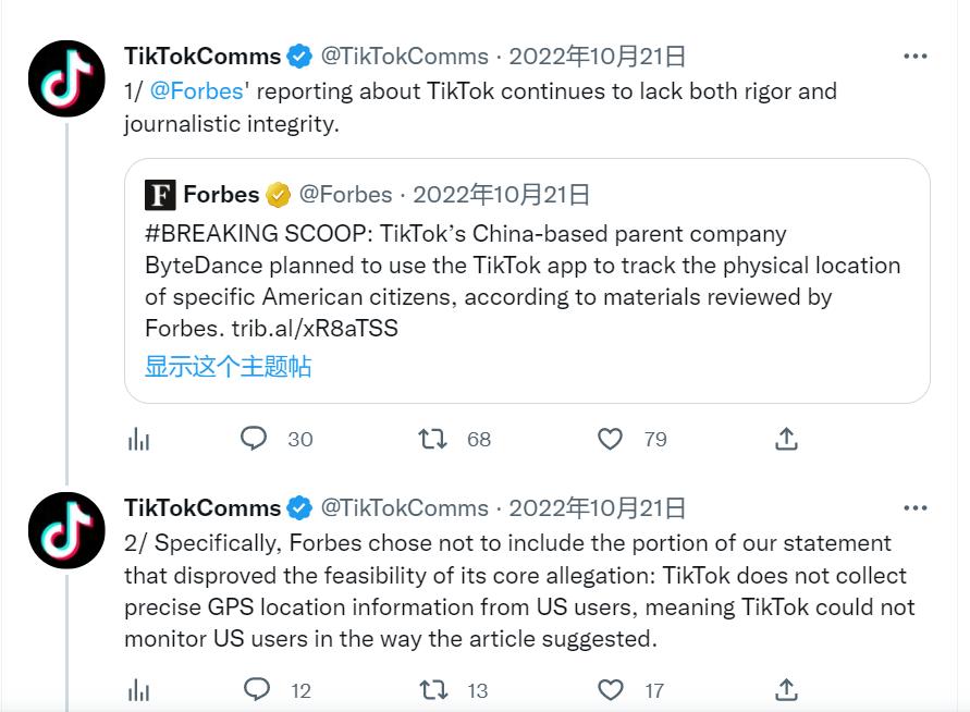 TikTok 否认福布斯报道内容|来源:Twitter