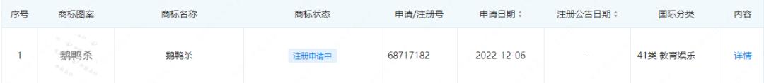 并且,这次《鹅鸭杀》爆火,也吸引了不少国内不少厂商的关注。比如企查查显示,《鹅鸭杀》国内商标已经被武汉鸣友网络科技有限公司申请注册。该公司为武汉微派网络科技有限公司全资子公司,后者曾开发并运营过《贪吃蛇大作战》等多款产品。