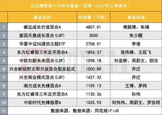 从重头持股基金来看,买入立讯精密不乏明星基金经理的身影。傅鹏博、朱璘管理的睿远成长价值混合基金持有4807万股,占流通A股比的0.68%,成为立讯精密十大流通股东,尽管在2022年二季度开始减仓,该基金仍然是第五大流通股。