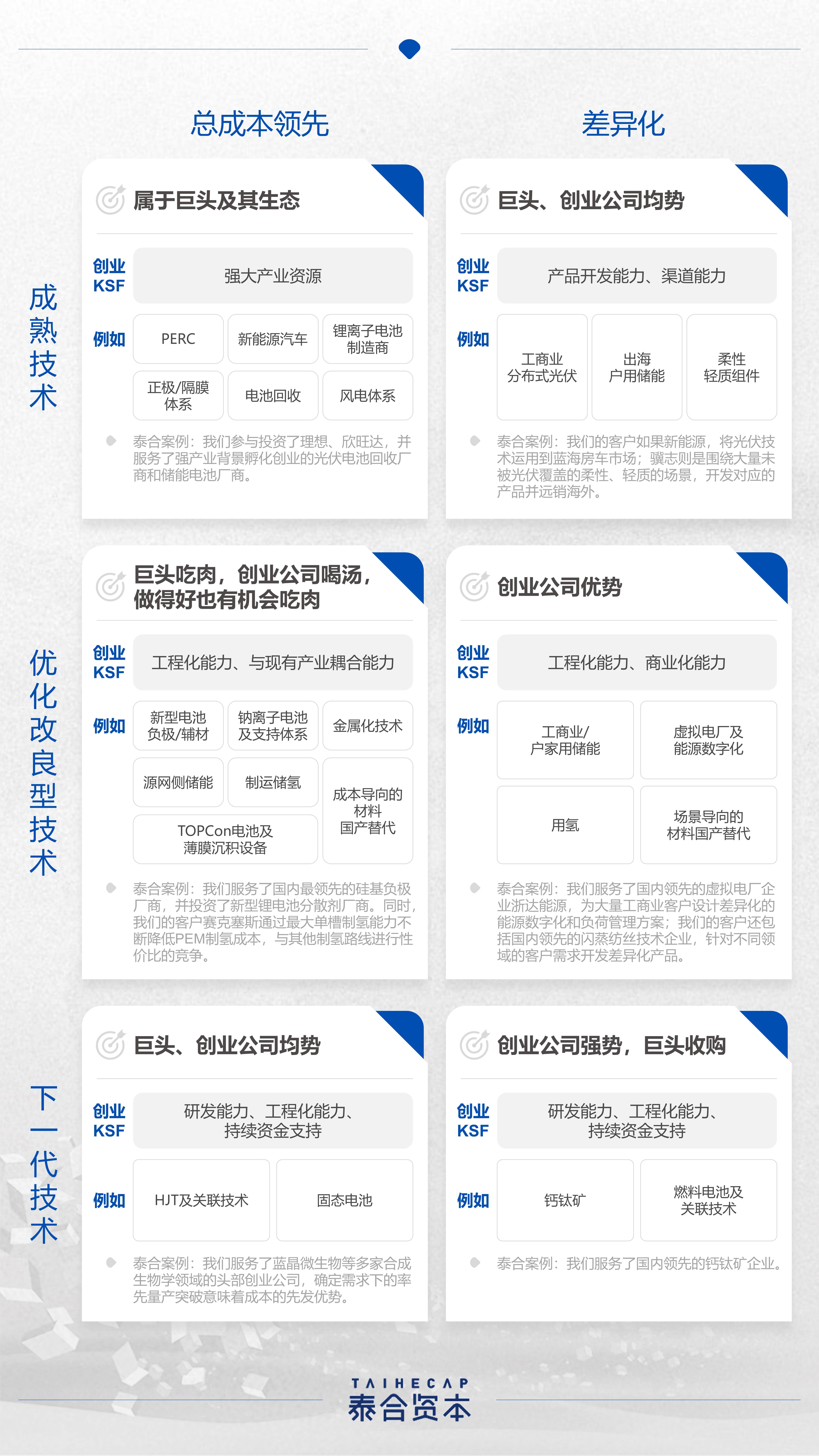 成熟技术。例如P型光伏电池、锂离子-石墨电池技术、风电技术体系,已经在过去15年乃至更长时间经历了长期技术发展和几轮完整的盖 特纳周期,大量关键生产制造环节受益于产业集群、规模效应、政策内部化带来的要素成本比较优势变化,诞生了成熟而强有力的产业巨头。巨头游戏中,新公司入局机会不多,出于商业价值的差异化战略和出于安全价值的国产替代主题,是可以捕捉的价值来源。