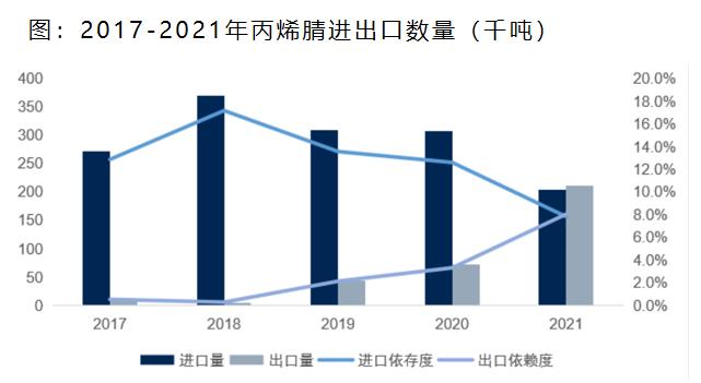 产业链上游-丙烯腈进口逐年下降:丙烯腈是聚丙烯腈原丝主要原材料,属于大宗基本有机化工产品。2017-2020年,国内丙烯腈处在供不应求,依靠进口,随着2019年新建产能逐步释放,截至2021年12月底,国内丙烯腈总产量突破261万吨。