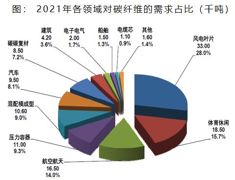 产业链中游-碳纤维需求旺盛:2021年全球碳纤维需求总量11.8万吨,对比2020年的10.69万吨,同比增长10.4%。细分领域中,风电叶片、体育休闲和航空航天领域需求最大,分别为3.30万吨、1.85万吨和1.65万吨。