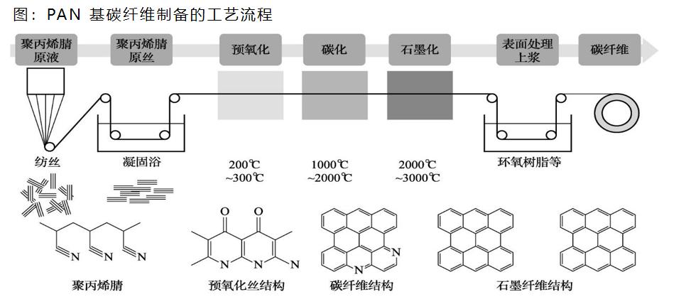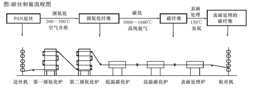 聚丙烯腈基(PAN)碳纤维的制备过程冗长复杂,主要包括原丝的制备、预氧化和碳化三大工艺,制备高模量碳纤维还要进行石墨化等后处理。