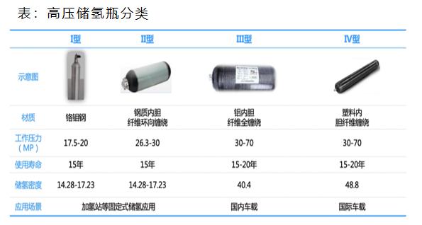 产业链下游-压力容器:根据《美国氢能经济路线图》发布的规划,美国计划至2030年推广氢能源车530万辆,预计在全美范围内建设5600个加氢站。目前已商业化的高压储氢气瓶分为四种,I型、II型、III型及IV型,其中III型及IV型35Mpa和70MPa中碳纤维及其复合材料占成本的60%以上,国内储氢瓶平均售价在2-3万元。