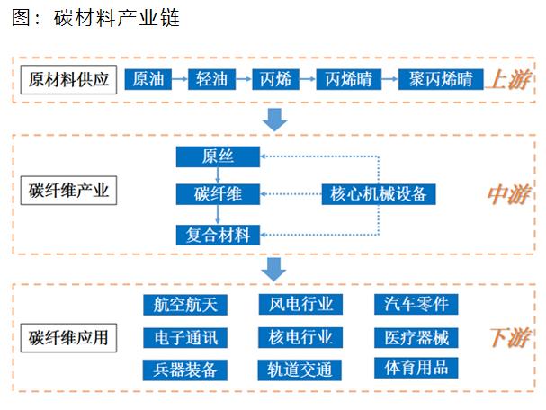 产业链中下游企业经过预氧化、碳化后得到碳纤维;制成碳纤维织物和预浸料;与树脂、陶瓷等材料结合,形成碳纤维复合材料。