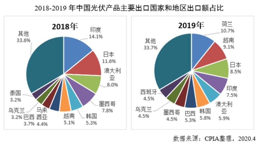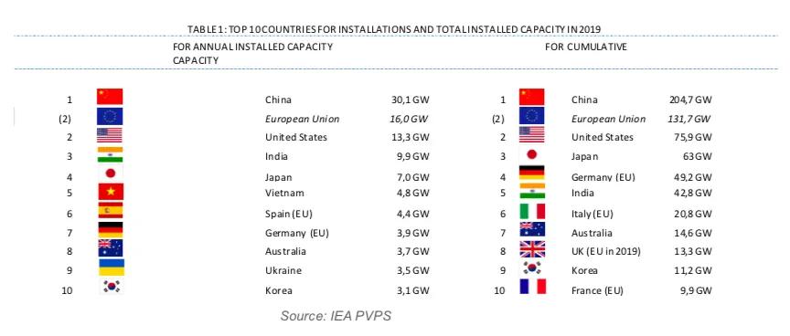2019年全球太阳能光伏装置量前十名的国家和地区排名