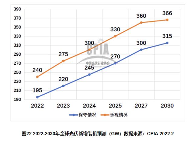 2022-2030年全球光伏新增装机预测(GW) 数据来源:CPIA.2022.2