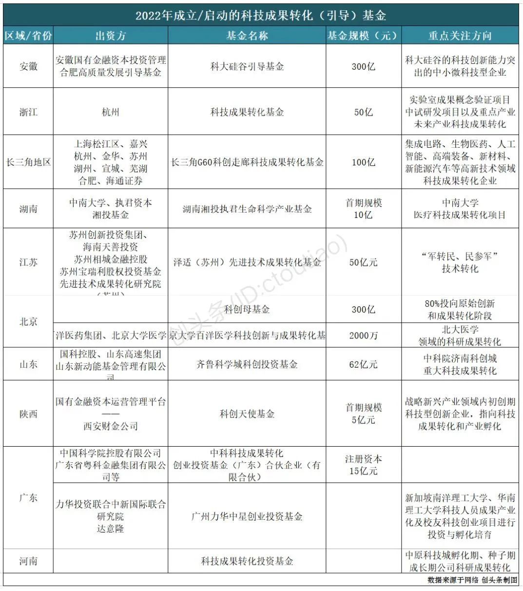据创头条(ID:ctoutiao)不完全统计,在刚过去的2022年,各地新设立或启动的大大小小的科技成果转化基金至少10余支,总规模近千亿元。它们大都围绕着科研院所、高校布局,主要用于早期科技项目的孵化。