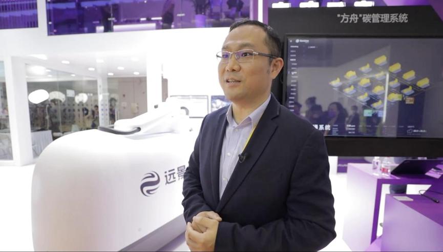 2021进博会展台,孙捷现场介绍远景“方舟”碳管理系统和魔奇充电机器人