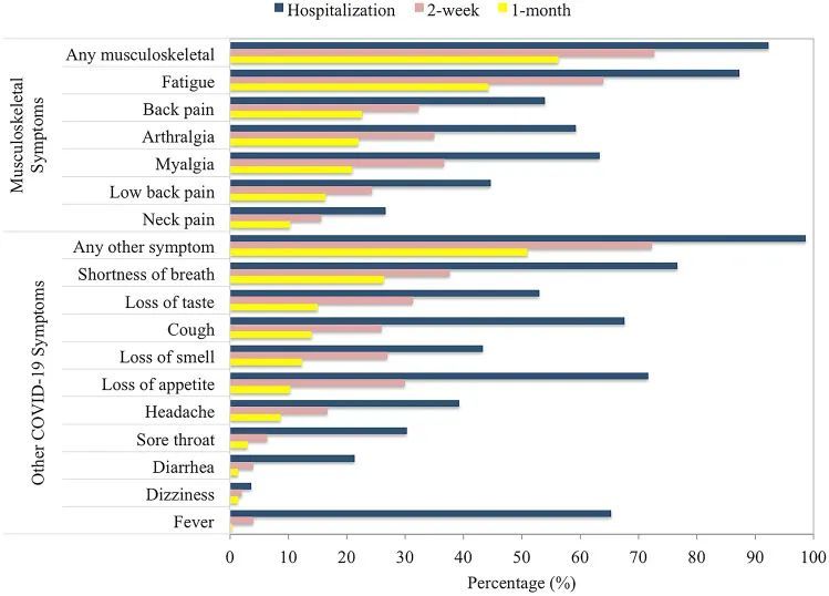 一项针对新冠入院患者的调研表明,严重的肌痛在患者中很普遍。最常见的肌肉骨骼症状是疲劳,其次是肌痛、关节痛和背痛,关节痛主要集中在腕关节、踝关节和膝关节。[3]