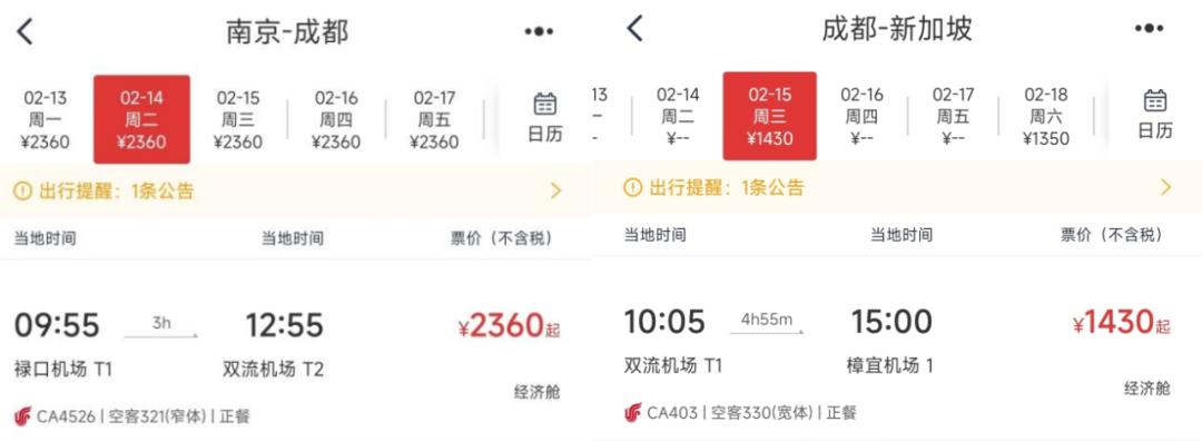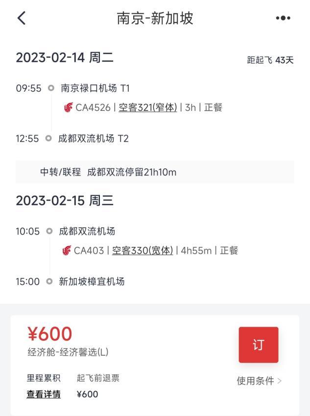 比如,在中国国航App上,潘哥发现今年2月14日,南京飞往新加坡的航班,机票售价仅为600元,需要在成都双流机场转机,航班全程约29个小时。