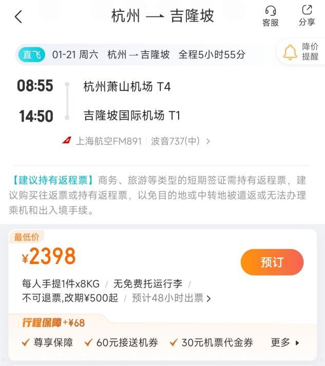 但是,直接从中转地杭州,直接乘坐1月21日的MU4775,机票价格竟然为2398元,比北京到吉隆坡的两段机票,还要贵540元。
