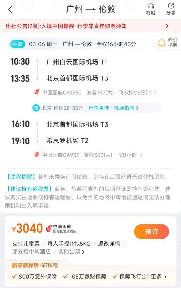 与此同时,潘哥还发现,今年3月6日,广州飞往英国伦敦的航班,由中国国航执飞,多段机票价格3040元,全程16个小时,需要在北京首都机场转机。