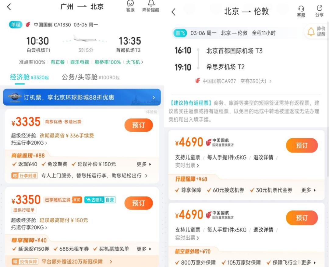 但是,如果在北京首都机场,乘坐同一趟航班,飞往伦敦希思罗机场的话,机票价格就变成了4690元,比广州到伦敦的两段航班,价格上贵了1650元。同时,广州飞往北京的同一趟航班,机票价格则为3335元,也比广州到伦敦的航班,贵了295元。