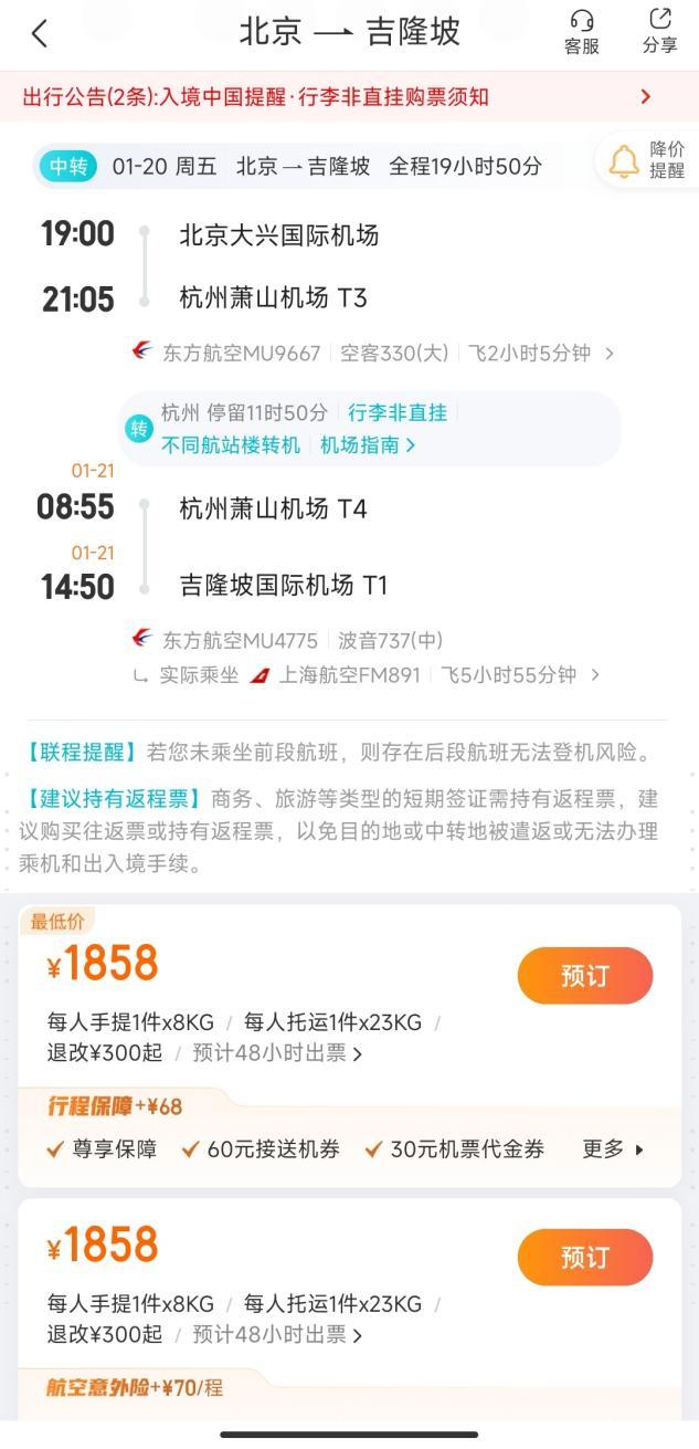 潘哥发现,去哪儿App上,今年1月20日,由北京飞往马来西亚吉隆坡的航班,两段机票售价1858元,全程近20个小时,在杭州转机停留近12个小时,最终杭州到吉隆坡执飞的航班是1月21日的MU4775。