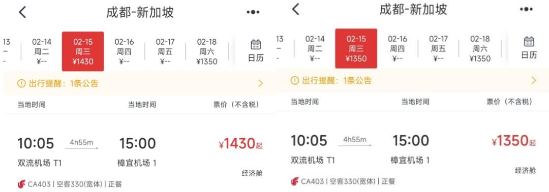 比如,潘哥发现在国航App上,2月15日成都飞往新加坡的航班,上午显示为1350元,到了下午就变成了1460元,价格比之前贵了110元。