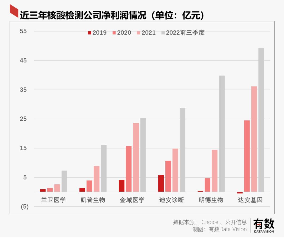 当前,已上市核酸检测概念股主要有六家,这些公司近三年的净利润总计328.14亿元,按照2019年12.18亿的利润总额计算,这六家公司近三年赚了三十年的钱。