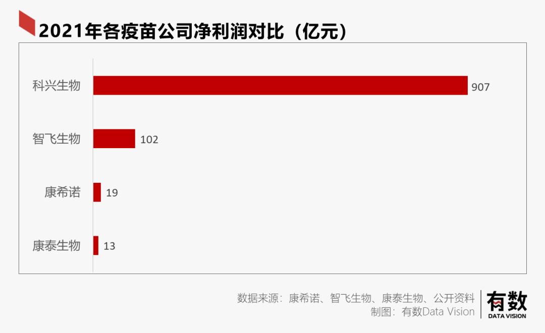 2021年,科兴净利润高达907亿元,是过去5年利润总和的100倍以上;智飞生物净利润102亿,同比增长209%;康希诺从亏损4亿元到净赚19亿。