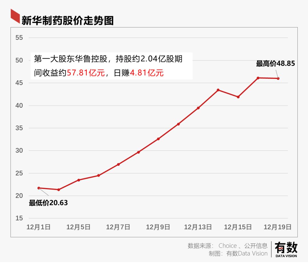 去年12月,新华制药只用了12个交易日就完成了136.8%的涨幅,几乎每天一个涨停。期间,第一大股东华鲁控股,总收益高达57.81亿元,日赚4.81亿。