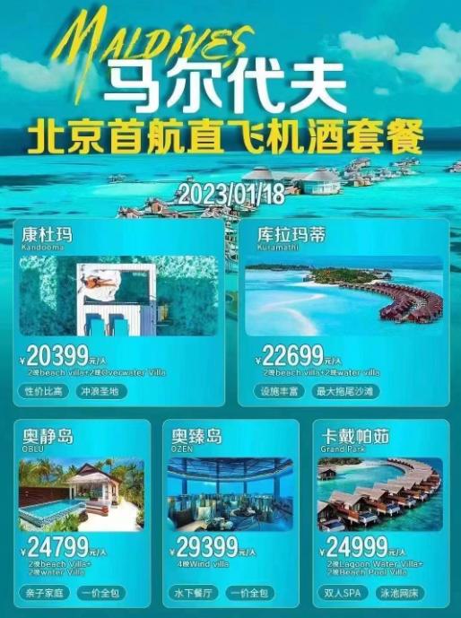 从疫情前马尔代夫的老牌旅行社批发商近期打出的广告来看,价格从1月18日最低的20399元/人到33999元/人的尼亚玛岛,费用均比疫情前一度低至万元以下的马尔代夫旅游产品有一定幅度上涨,但仍免不了让沉寂三年的出境游从业者狂欢一场。