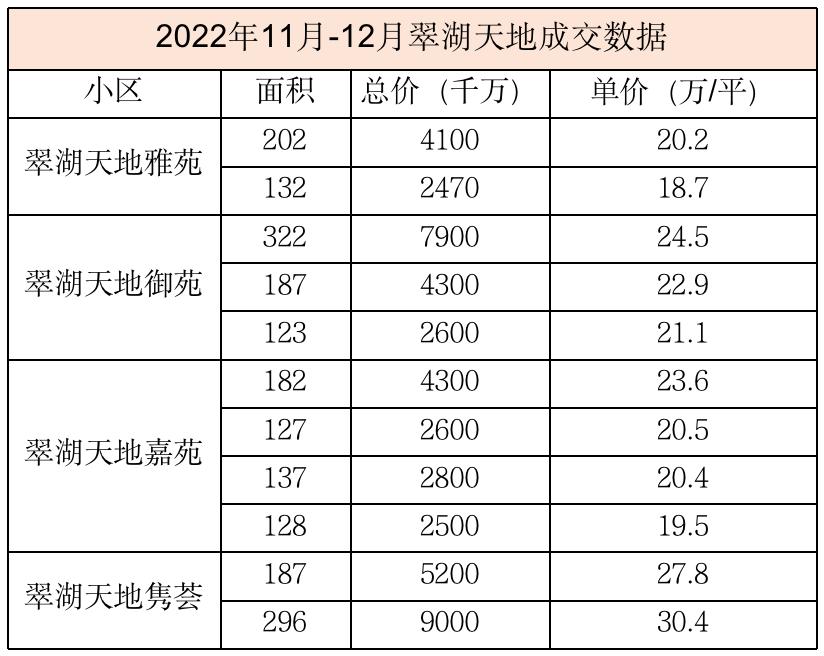 可以看到曾经动辄30万/平的翠湖天地,最近的成交也就在20万/平左右。