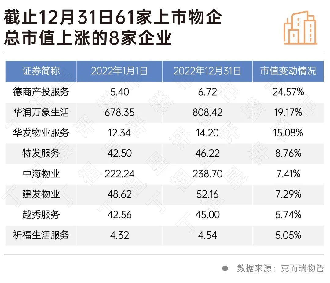 市值方面,截止2022年12月31日,61家上市物企总市值较年初上涨的只有8家,其中德商产投服务、华润万象生活和华发物业服务市值涨幅排在前三,涨幅均在15%以上。