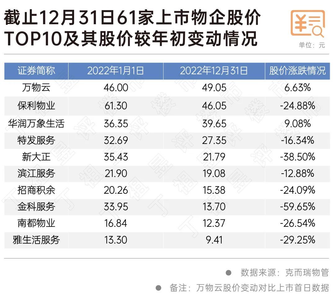 根据克而瑞物管监测数据显示,截止2022年12月31日,上市物企股价均值较年初整体下跌超过30%,61家上市物企仅有4家企业股价较年初或上市首日有所上涨。