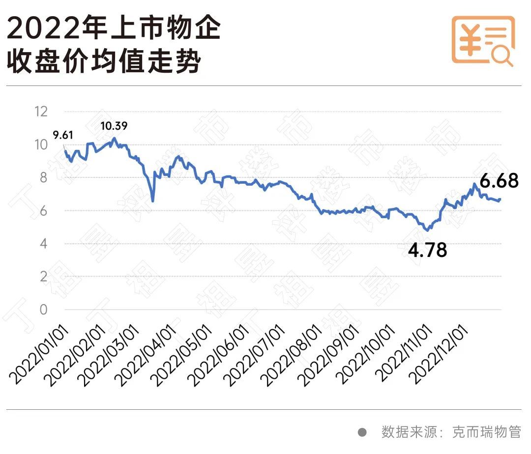 2022年,物业股持续下探。克而瑞物管数据显示,61家上市物企股价均值由年初的9.61港元下跌至6.68港元,整体跌幅达30.47%。
