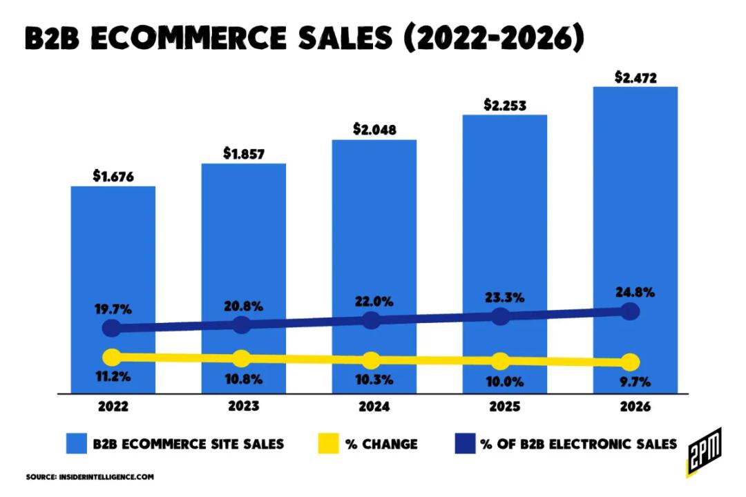 在跨境电商的重要目标市场美国,B2B电商市场规模超过万亿美元。数据预测,2022年底,美国B2B电商销售额将达到1.6万亿美元,到2026年,将超过2.47万亿美元。