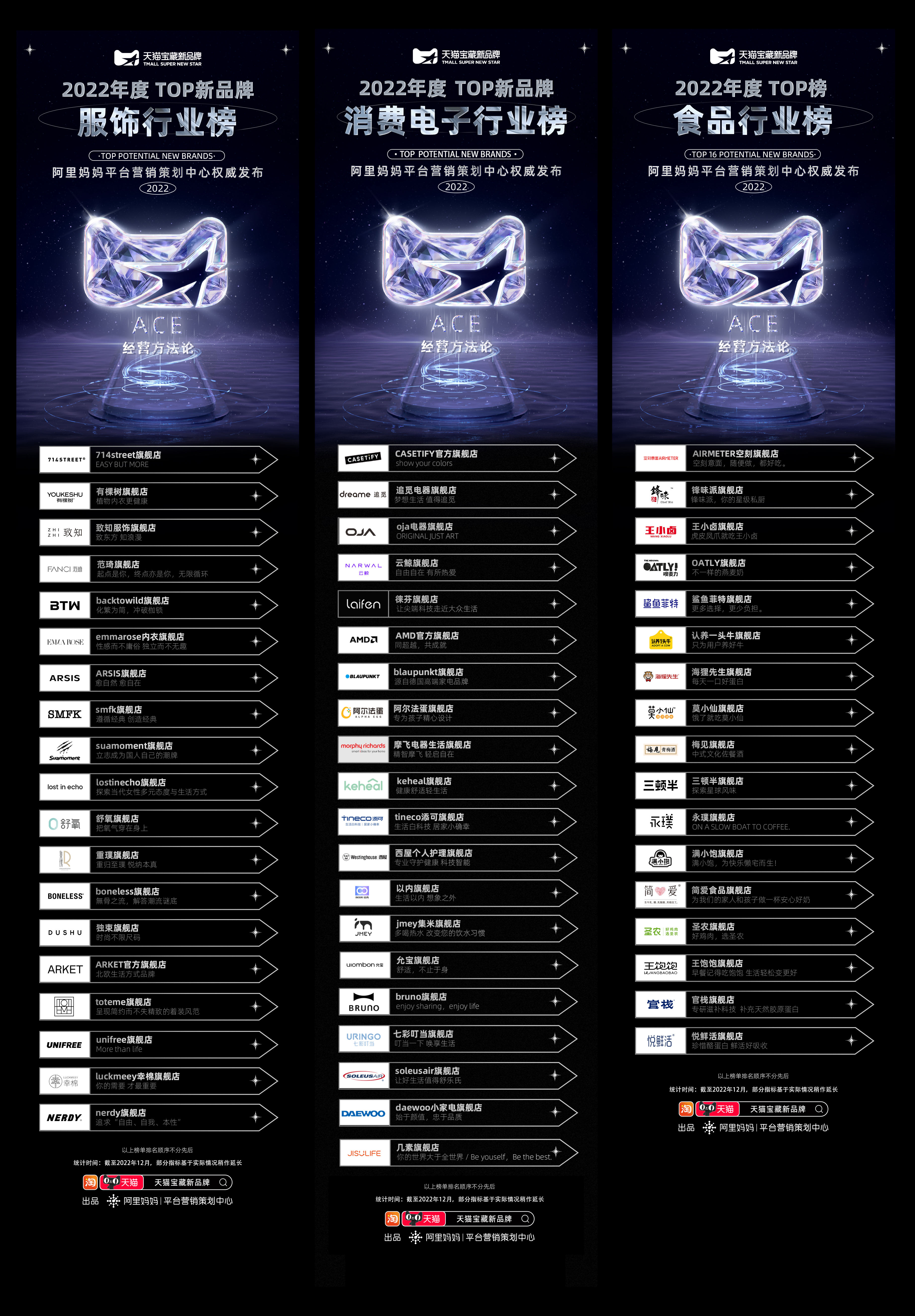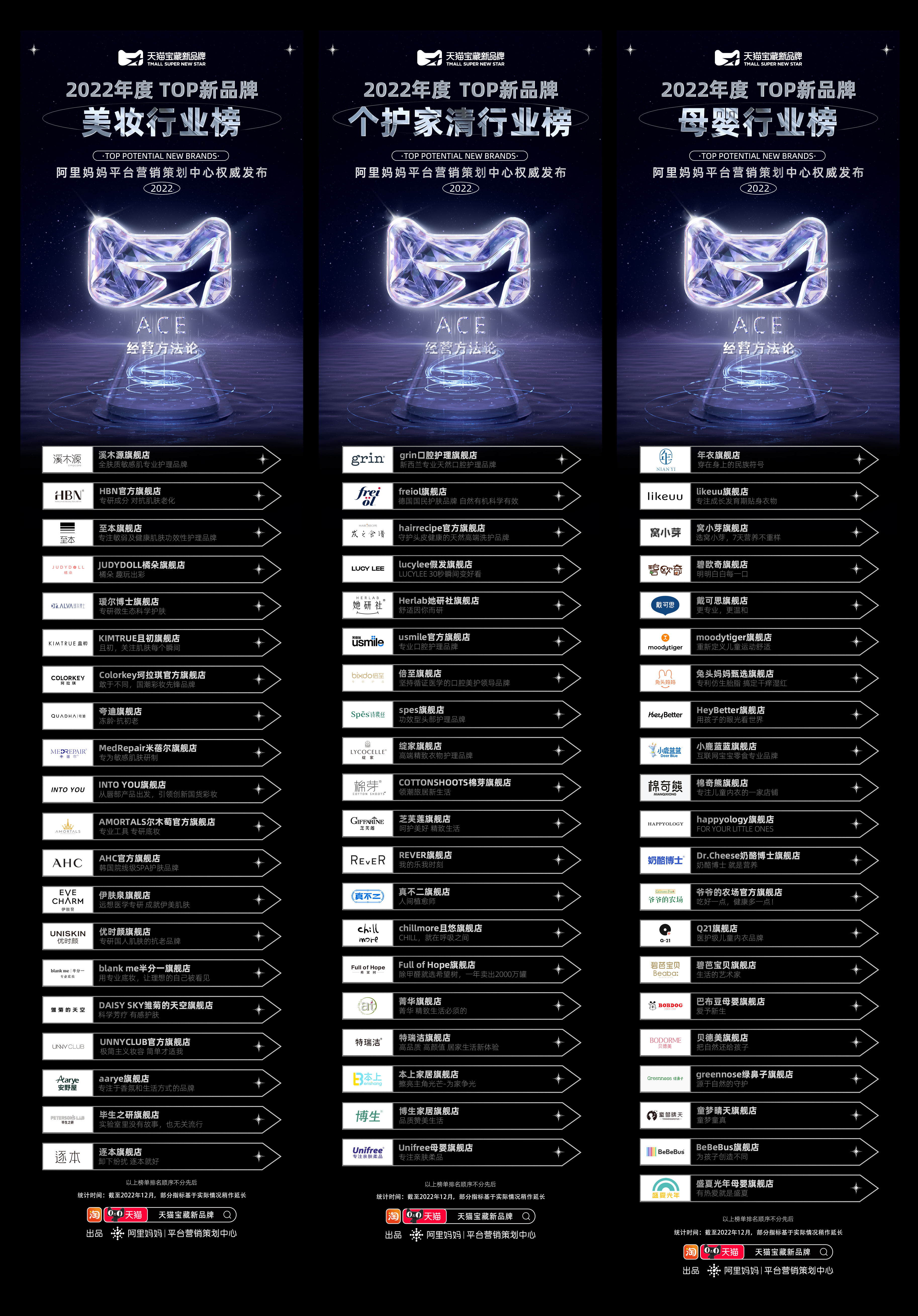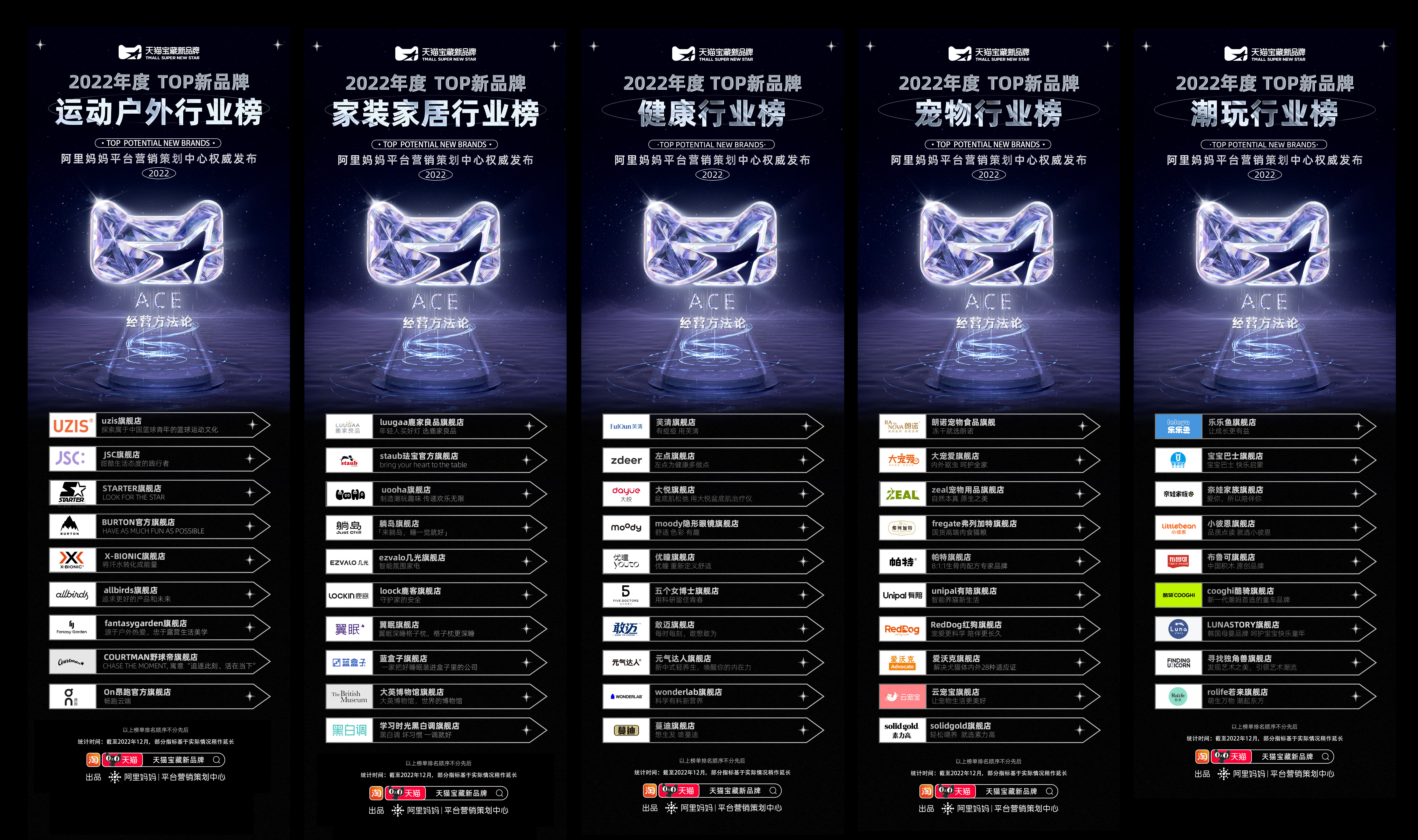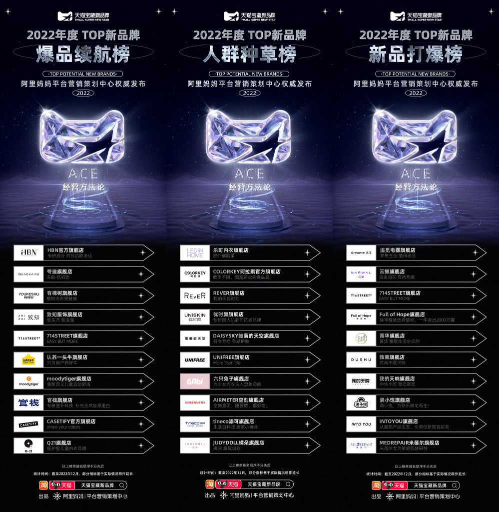而回顾2022,一些逆势增长的新品牌,展示出一种别样的气质。1月6日,一份充满着商业生命力的榜单面世。在整合天猫平台内2022年整体消费趋势动态后,经由天猫大快消、消费电子、服饰时尚、运动户外、食品生鲜、家装家居、健康、宠物等行业推选,结合ACE方法论对新品牌人群、货品、经营效率的综合评判,最终由阿里妈妈平台营销策划中心旗下主攻新品牌孵化的业务“天猫宝藏新品牌”,正式推出2022宝藏新品牌年度榜单,榜单包含了ACE总榜、人群种草榜、新品打爆榜、爆品续航榜以及各大行业榜单。