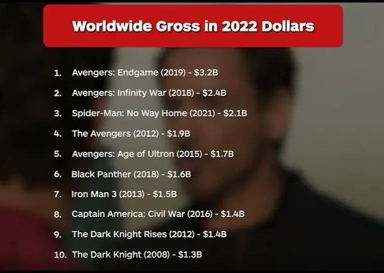 2013-2022年,DCEU中所有11部电影全球票房,用2022年大通胀后美元币值调整后统一计算,总和是75亿美元;漫威宇宙电影票房前三名之和,用同样币值计价,是78亿美元。
