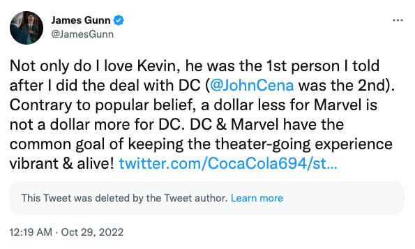 詹姆斯·古恩曾在社交平台发文说,“费奇是我跟DC签合同之后第一个告知的人......漫威少赚一美元,并不等于DC多赚一美元,我们的目标是一致的”,两人虽然曾为好友,但各自率领着“对立阵营”,这话怎么理解真得见仁见智。