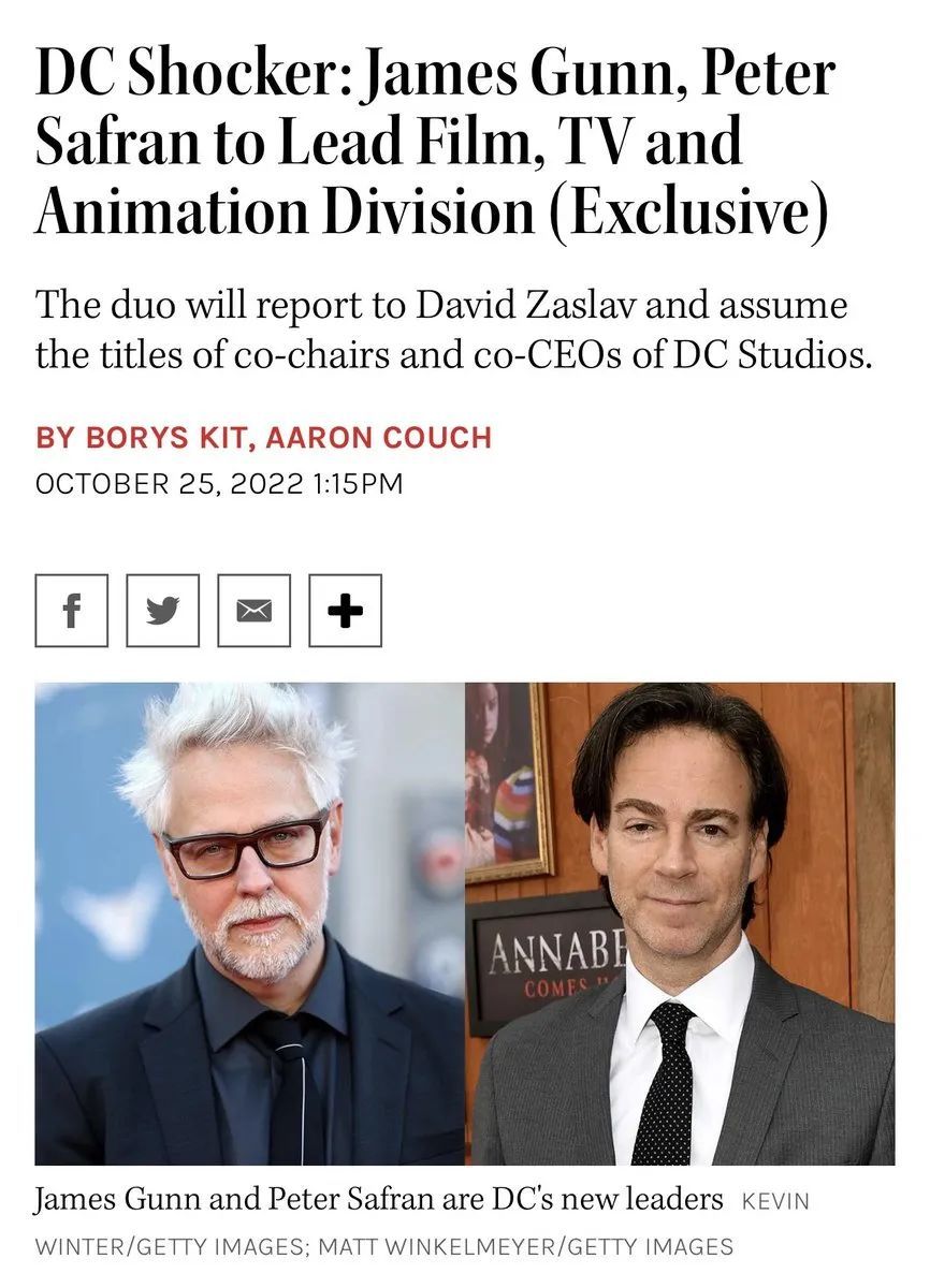 最后谈妥的安排,是詹姆斯·古恩与彼特·萨法兰做“DC工作室”(“DC影业”改名后)的联合CEO。“滚导”负责创意内容与粉丝互动,而在业内享有“运营靠谱”声誉的萨法兰负责公司日常运营。