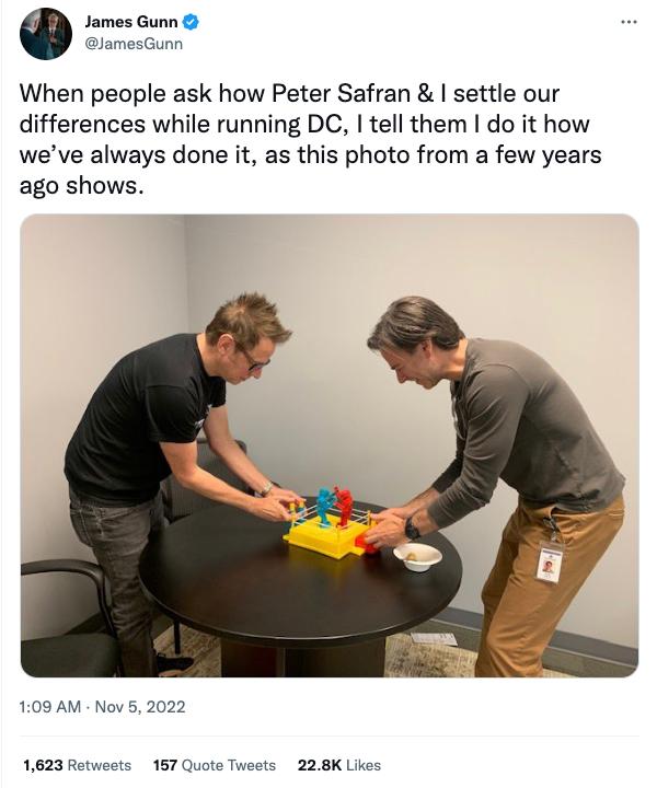 2022年10月底,詹姆斯·古恩与彼特·萨法兰被官宣,将接掌“DC工作室”这一DC影视业务更名后的业务线,除了向华纳影业的联合CEO迈克·德·卢卡和帕姆·阿布迪汇报外,还直接向华纳兄弟探索公司的CEO扎斯拉夫汇报。