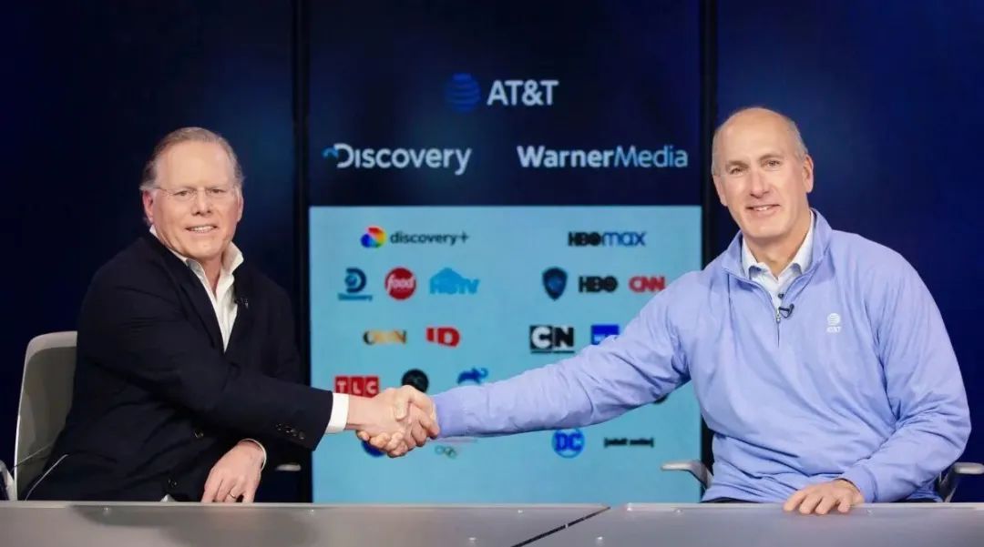 △ 前探索频道CEO大卫·扎斯拉夫(左)与华纳母公司AT&T的CEO约翰·斯坦基(右)于2021年5月17日握手宣布两家企业合并的消息