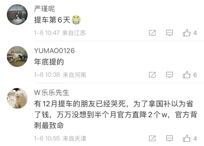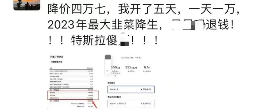 但最近刚刚提车的车主却自嘲为“韭菜”,有车主怒称:“开了五天,一天(降价)一万。”还有车主表示:“12月26日提的,心脏是今天停的。”