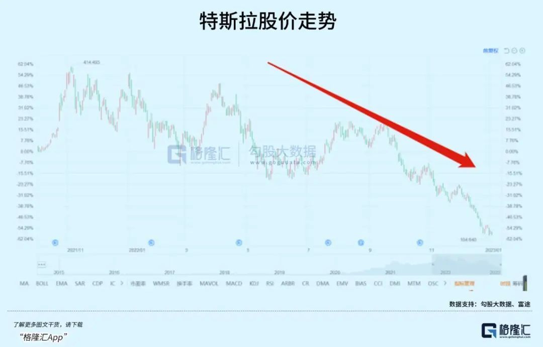 最近特斯拉的市场情绪也是十分脆弱,只要一个利空,就能够跌10个点,在过去一个月里,有三次大跌8个点以上的。其中,一次马斯克披露抛售特斯拉股票之时,一次是美国降价消息爆出后,还有一次是上海工厂被爆停产,最近的一次是新年后公布的2022年Q4交付量低于预期。