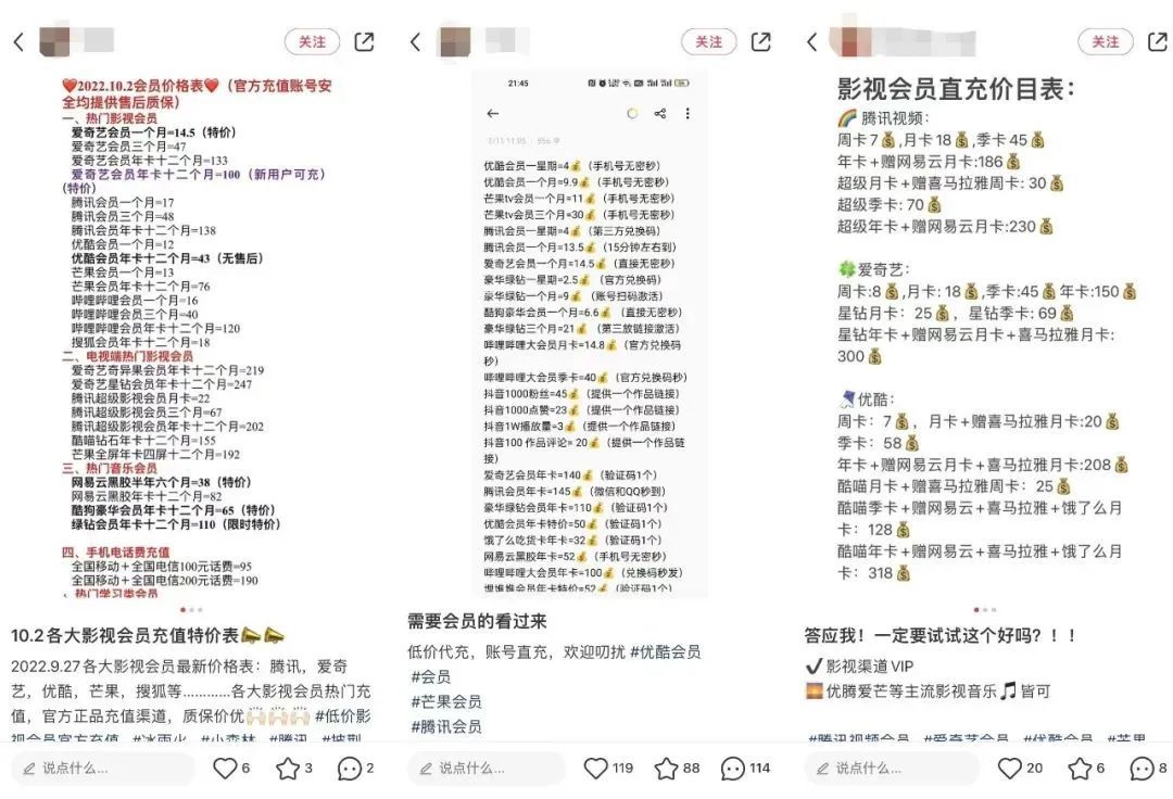 在不同社交账号分别输入“低价代充视频会员”,你或许才会真的理解,这到底是怎样一笔大“生意”。