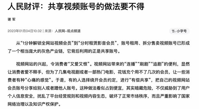 如近日人民网题为《共享视频账号的做法要不得》的评论文章所言,进行“有偿共享”,“看似占到便宜,其实暗藏危险,不仅威胁到了用户个人信息安全,扰乱了平台经营规则和视频内容生态,破坏了正常市场秩序,而且严重影响了国家网络治理以及知识产权保护。”