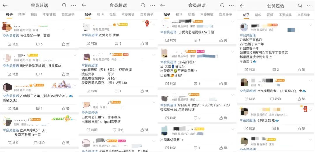 在微博,#会员#超话下几乎成为这批不法分子的集散地,除了视频会员也涉及音乐、购物、动漫等,除了售卖也不乏各类出租、共享和收购信息。