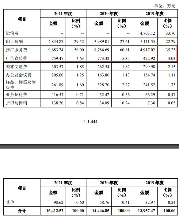 招股书显示,白家阿宽在2019年到2021年这三年的推广服务费和广告宣传费用合计分别为5339.94万元、9558.01万元和10443.21万元。